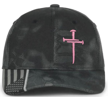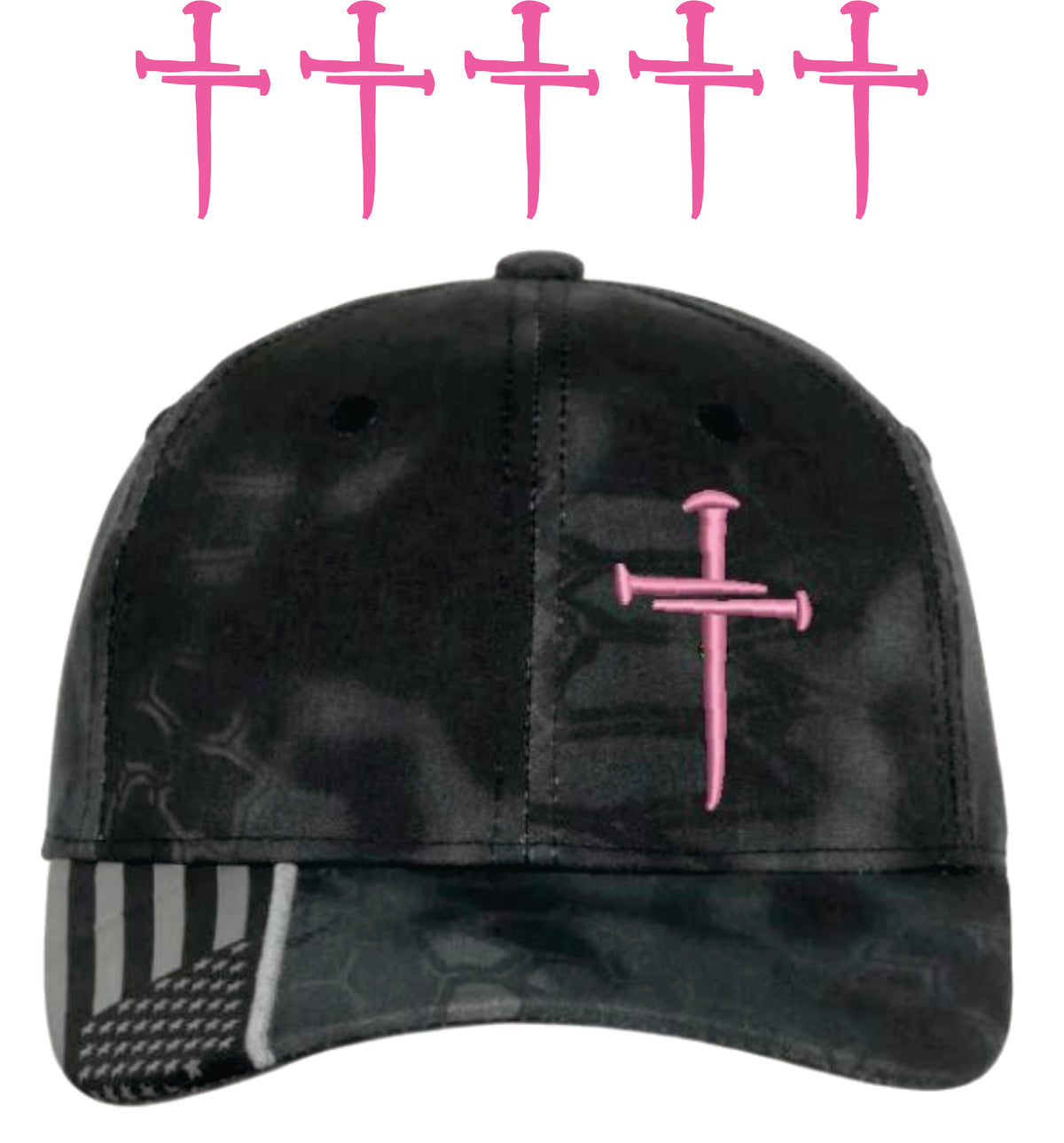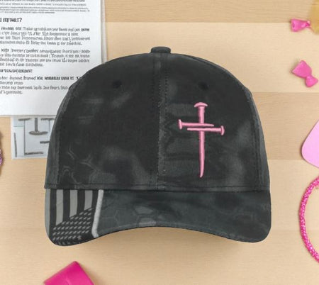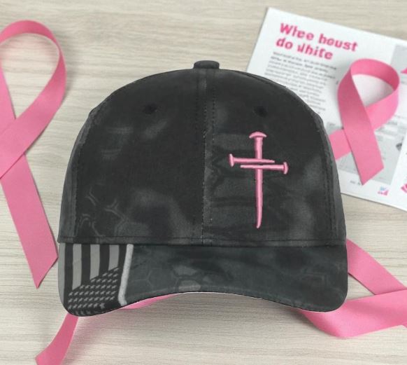 Breast Cancer Awareness Christian Cross Adjustable Hat with 5 Pink 3 Nail Cross Decals for Men or Women