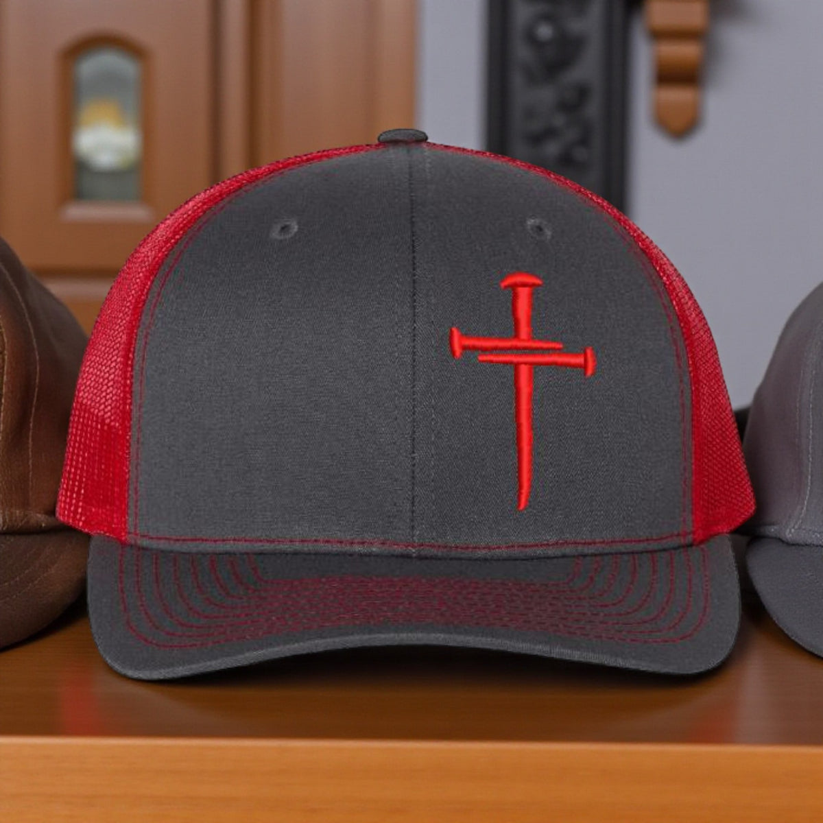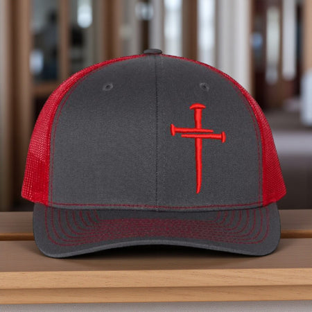 Christian Cross 3 Nail Jesus Cross Hat Richard Charcoal Red 112 Mesh back hat