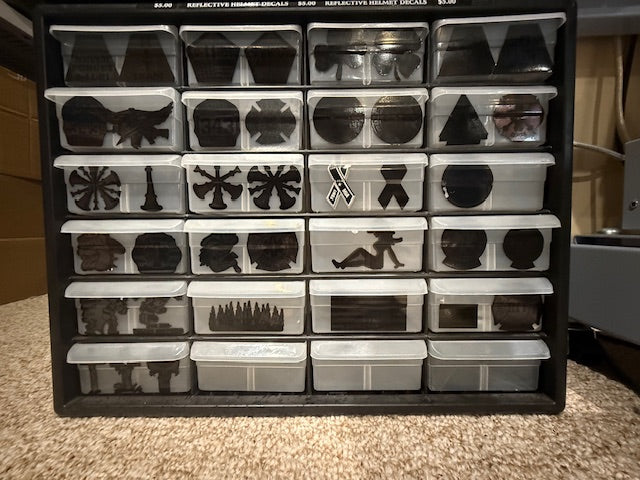 With this purchase, you get all of the reflective and regular helmet size decals in this bin of 24 bins. There are HUNDREDS of decals that you can use for re-sale, sell them online, use them for your own personal use, do whatever you want with them. This sale is a one time sales and what comes in these bins are as is. They are professionally printed, UV Laminted decals that are made to last.