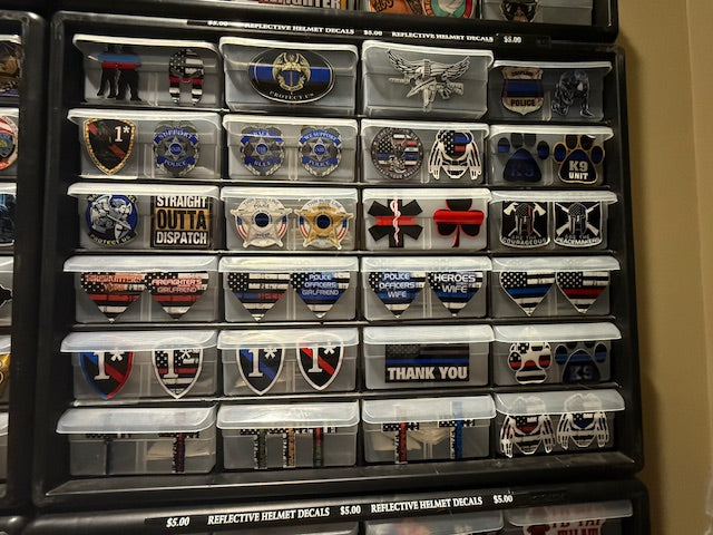 With this purchase, you get all of the reflective and regular helmet size decals in this bin of 24 bins. There are HUNDREDS of decals that you can use for re-sale, sell them online, use them for your own personal use, do whatever you want with them. This sale is a one time sales and what comes in these bins are as is. They are professionally printed, UV Laminted decals that are made to last.
