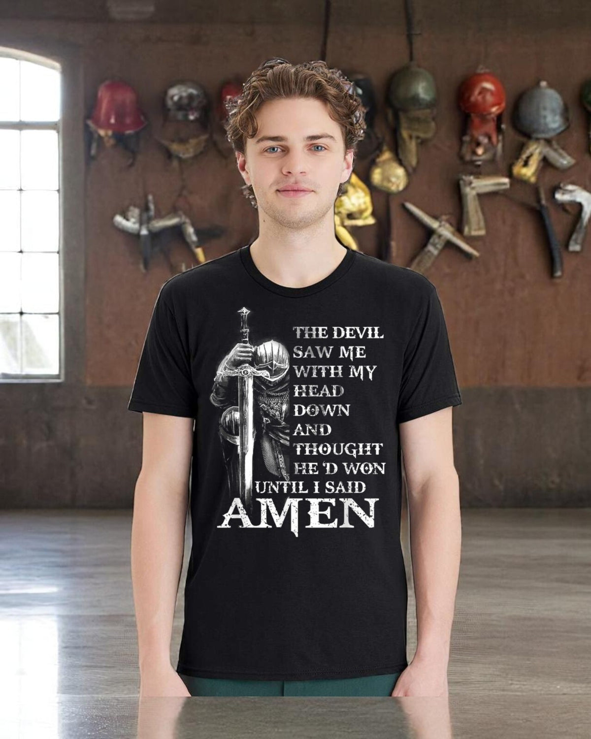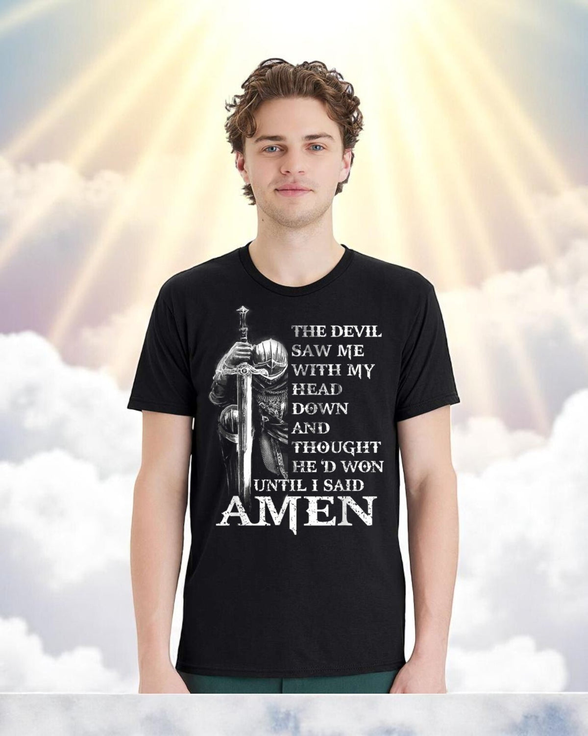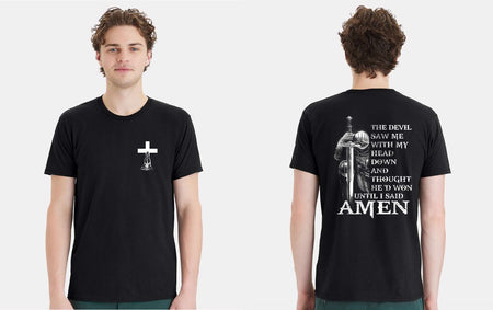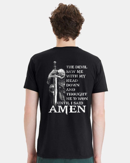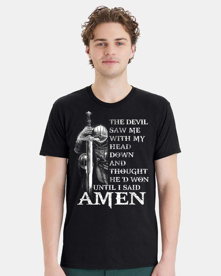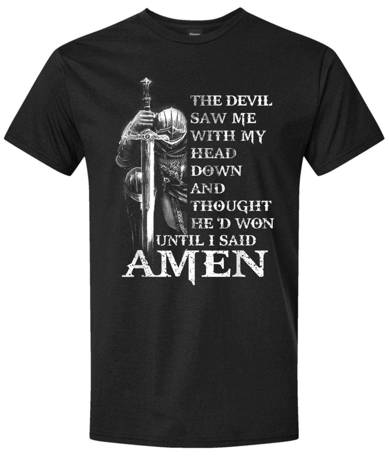 Mens Christian T-shirt Devil Thought He'd Won Until I said AMEN Short sleeve